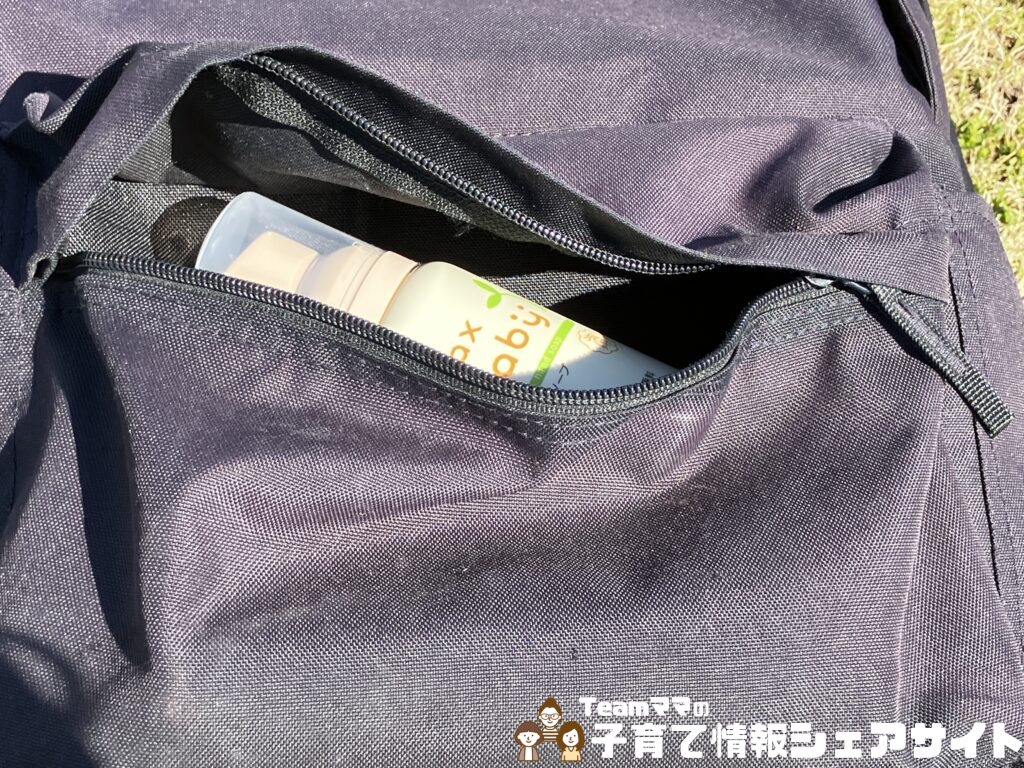 縦13.2cmです。1歳〜1歳半の靴ぐらい、無印のリュックの前ポケットに余裕で入る大きさ。キャップもついているので、バッグやリュックの中で漏れる心配もありません。お子さんがキャップを開けてしまう心配がある方はジップロックに入れておくと安心かもしれません。